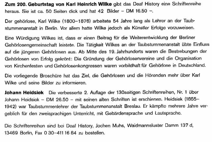 Die Interessengruppe zur Geschichte Gehörloser Deaf History hat das Rundschreiben Nr. 5 herausgegeben. Es enthält das Programm des 3. Deaf-History-Treffens, das vom 3.-5- November in Wiesbaden stattfindet. Zum 200. Geburtstag Carl Heinrich Wilkes ist eine Broschüre erstellt worden, die bei Deaf History erhältlich ist. |