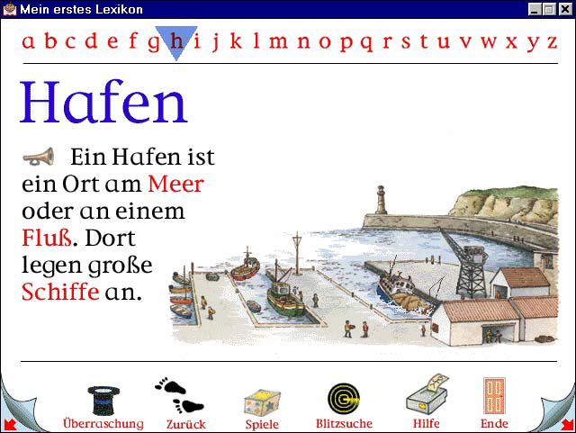 "Schiffe versenken" auf amerikanisch. (Nach Anklicken des Bildes läuft eine Animation ab: Eine Kiste fällt vom Kran und versenkt das Schiff im Hafenbecken.) Ob dieser Comics-Gag zur Verdeutlichung des Begriffes "Hafen" beiträgt? Die Kinder finden es jedenfalls spaßig.