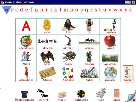 Für jeden Buchstaben gibt es eine oder mehrere Übersichtsseiten, auf denen alle vorkommenden Begriffe aufgelistet sind - mit Bildern! Auch hier wird beim Anklicken jedes Wort gesprochen.